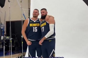這內(nèi)線組合能排前幾???掘金媒體日 約基奇和瓦藍一起拍定妝照~